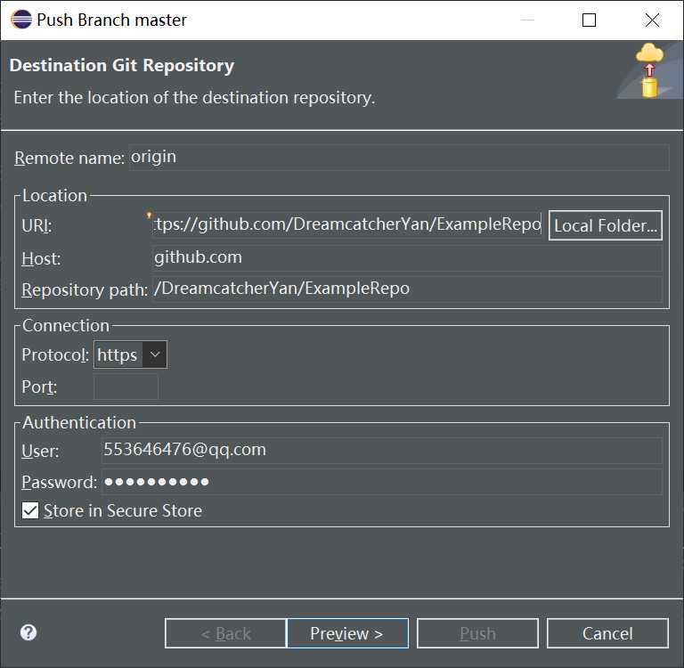然后,我把仓库地址填入location的URI中,在下面的Authentication输入自己的GitHub账号和密码。