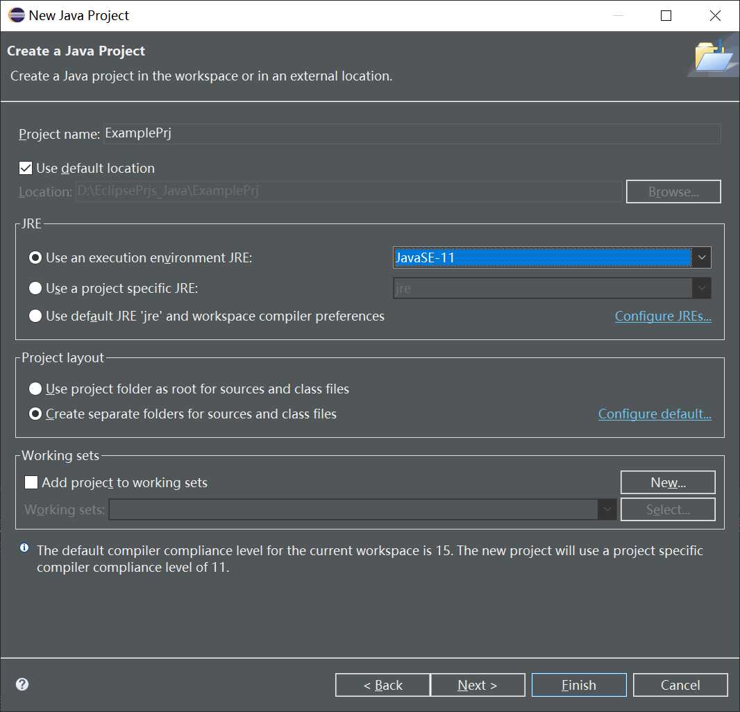 注意在创建项目时可以选择项目路径、JRE版本,这里我们都选择默认设置。然后直接Finish。