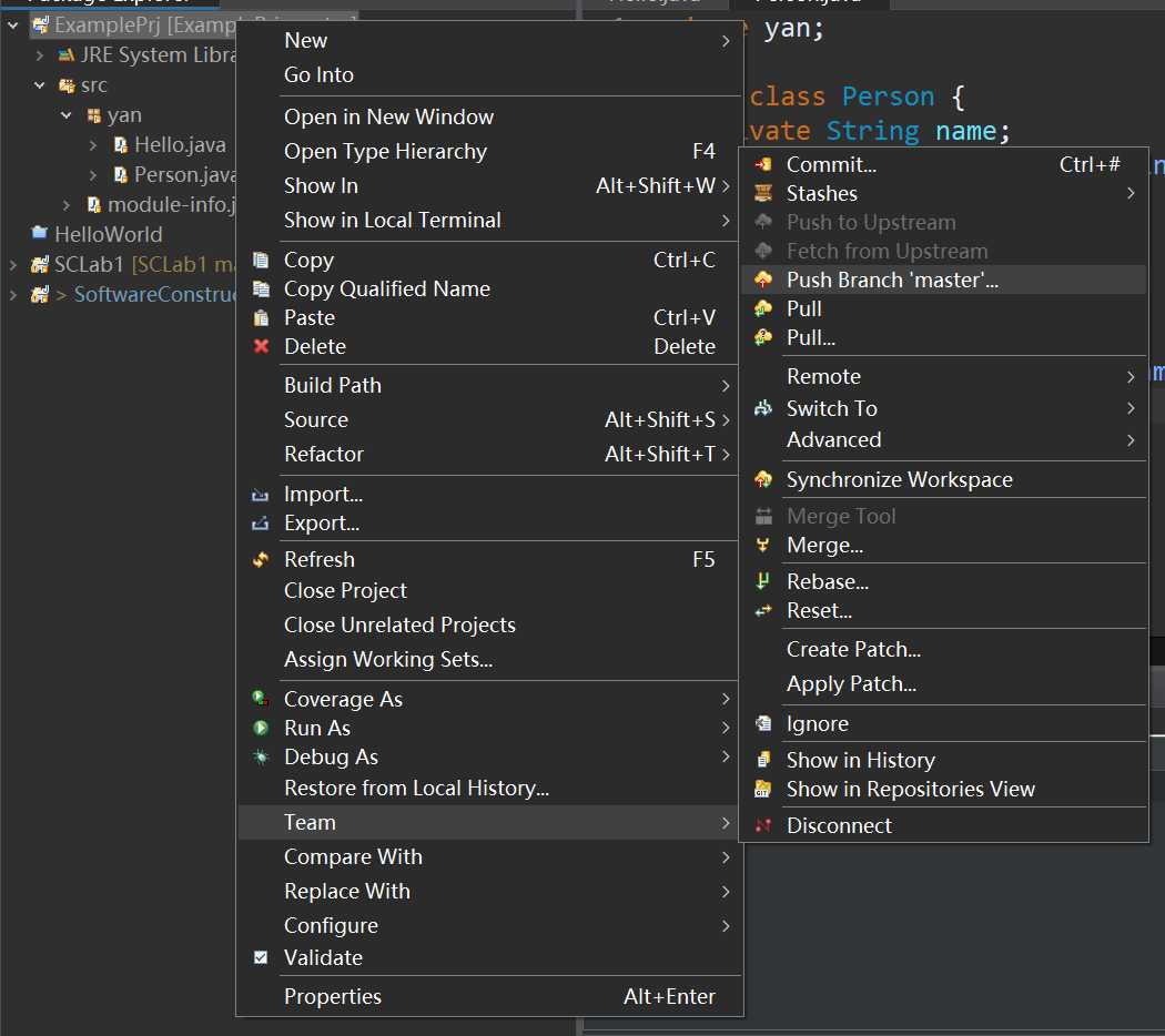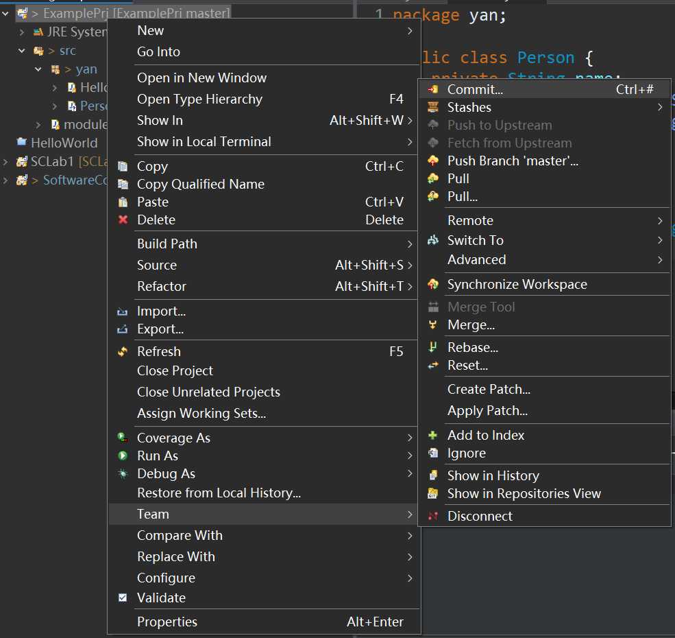 为了在Eclipse中演示git的add、commit操作,我们在yan包下新建一个Java类叫Person,并在里面稍微写一点代码,然后按Ctrl+S保存。