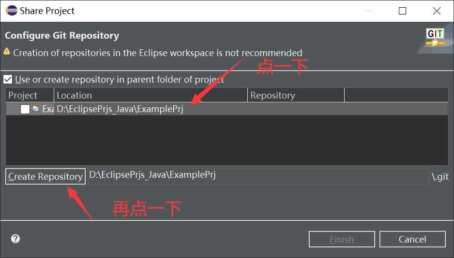 当上面这个框弹出来之后,勾选"Use or create repository in parent folder of project",然后按照下图的操作,先点一下项目,再点一下"Create repository"。