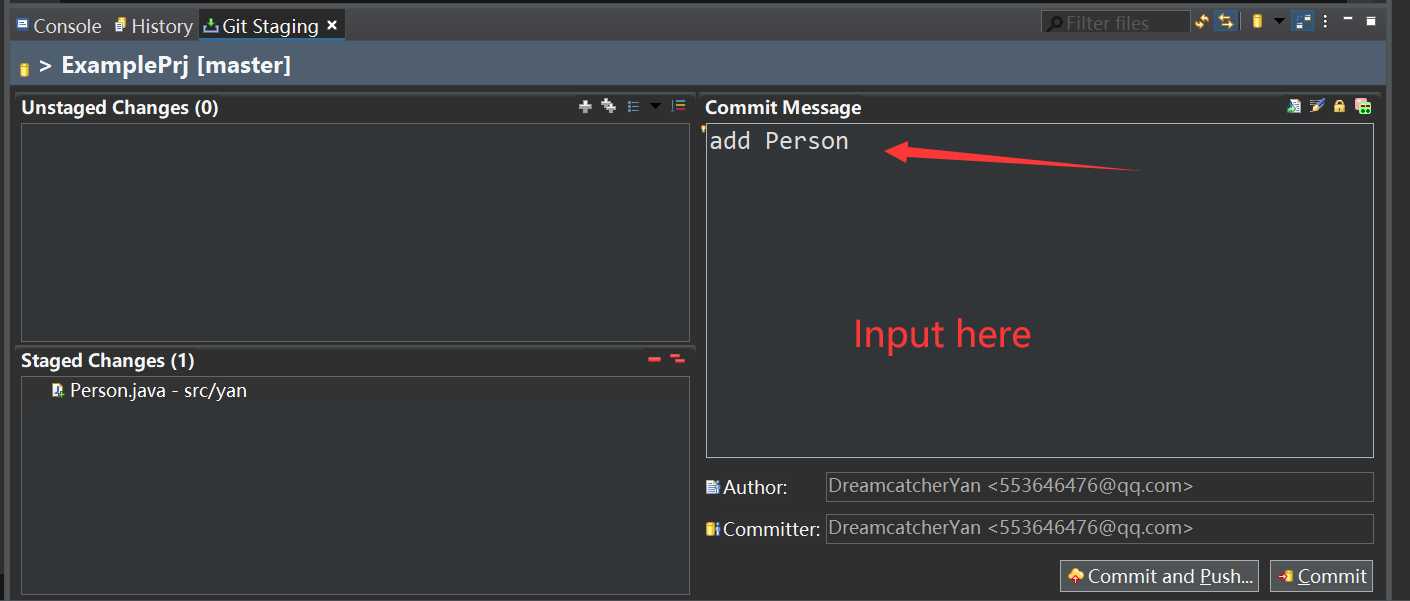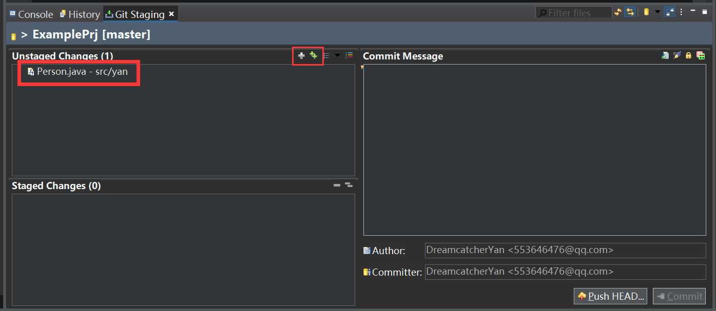 在"Unstaged Changes"里面可以看到刚刚编写的Person.java,我们可以点击框框上方的那两个加号将文件添加到git暂存区管理。