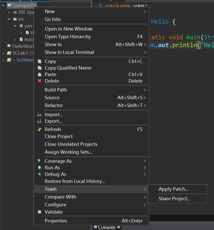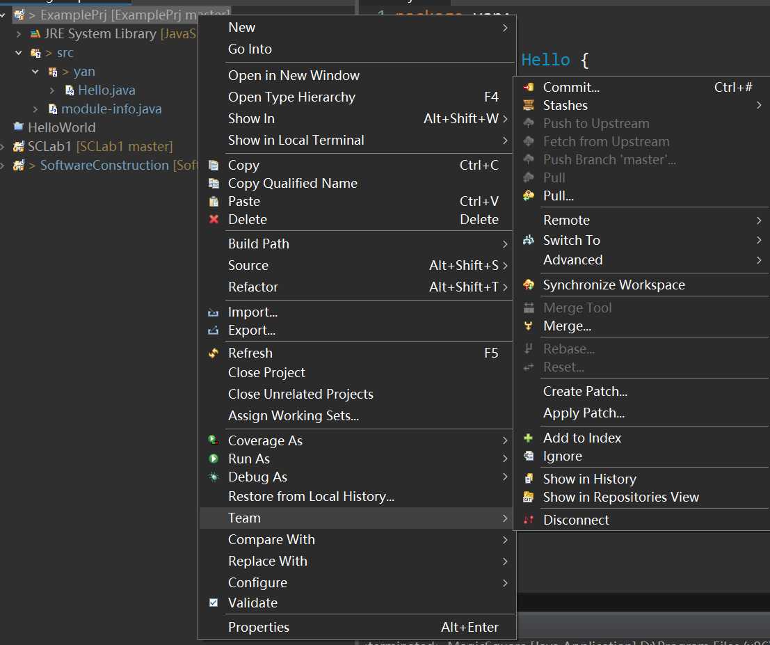 这时你在右击项目名称,把鼠标放到Team上,可以看到这些东西,可能你对这些东西一无所知,但是我们马上就来介绍他们的用法。