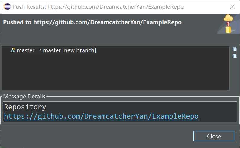 此时在eclipse的右下角可以看到push的进度条,这里因为内容较少,很快就push完成,完成后会出现下面的提示框。