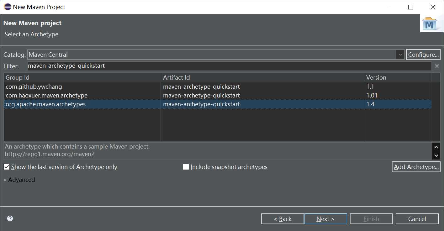 在Filter中输入信息可以快速找到所想要的骨架,例如这里使用"maven-archetype-quickstart",它是一个很简单的Java工程骨架。