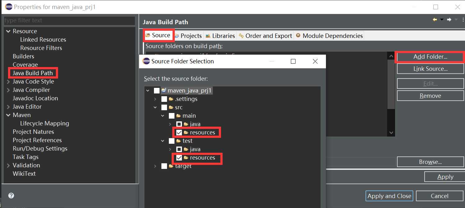 可以看到创建后的目录是不完整的,需要我们手动补全所有的目录(比如说resources),直接new Folder即可。但是new出来的resources文件夹不能被eclipse识别为资源文件夹,需要手动添加。