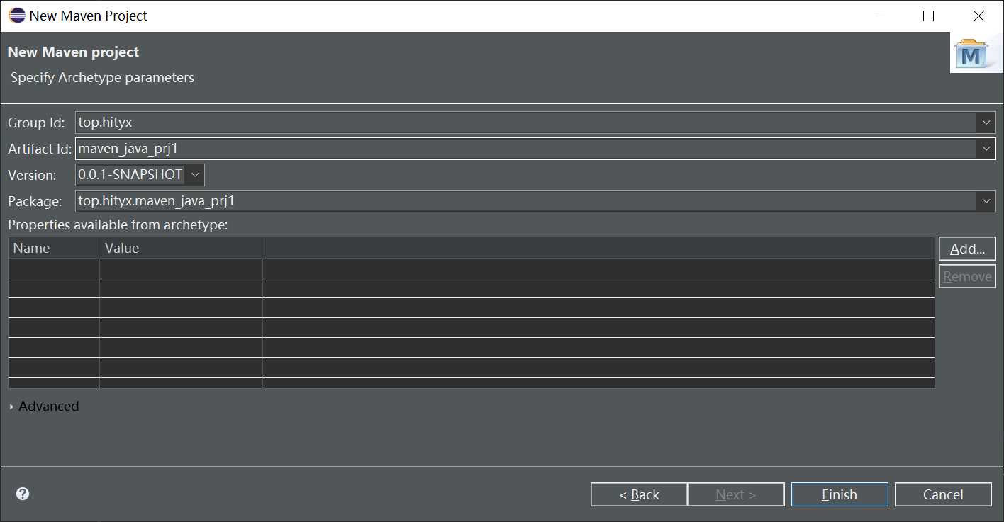 下载完成后,弹出一个框框,我们需要在这个框框内输入我们这个项目的坐标,至少要三个最基本的坐标信息:GroupId, Artifact Id, version。