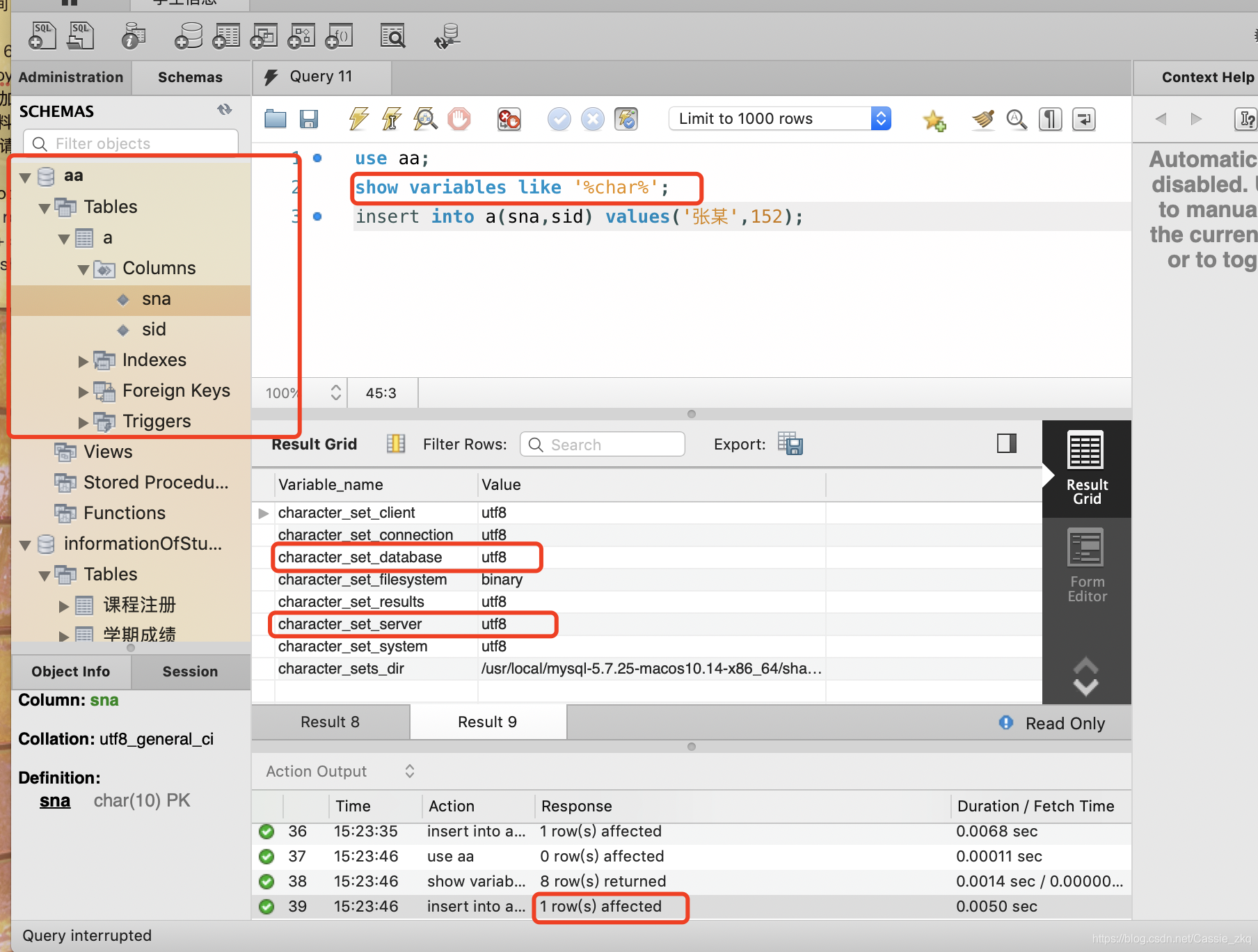 这样就可以直接支持中文字符了,因为my.cnf里面已经设置了default-character-set=utf8和character-set-server=utf8。