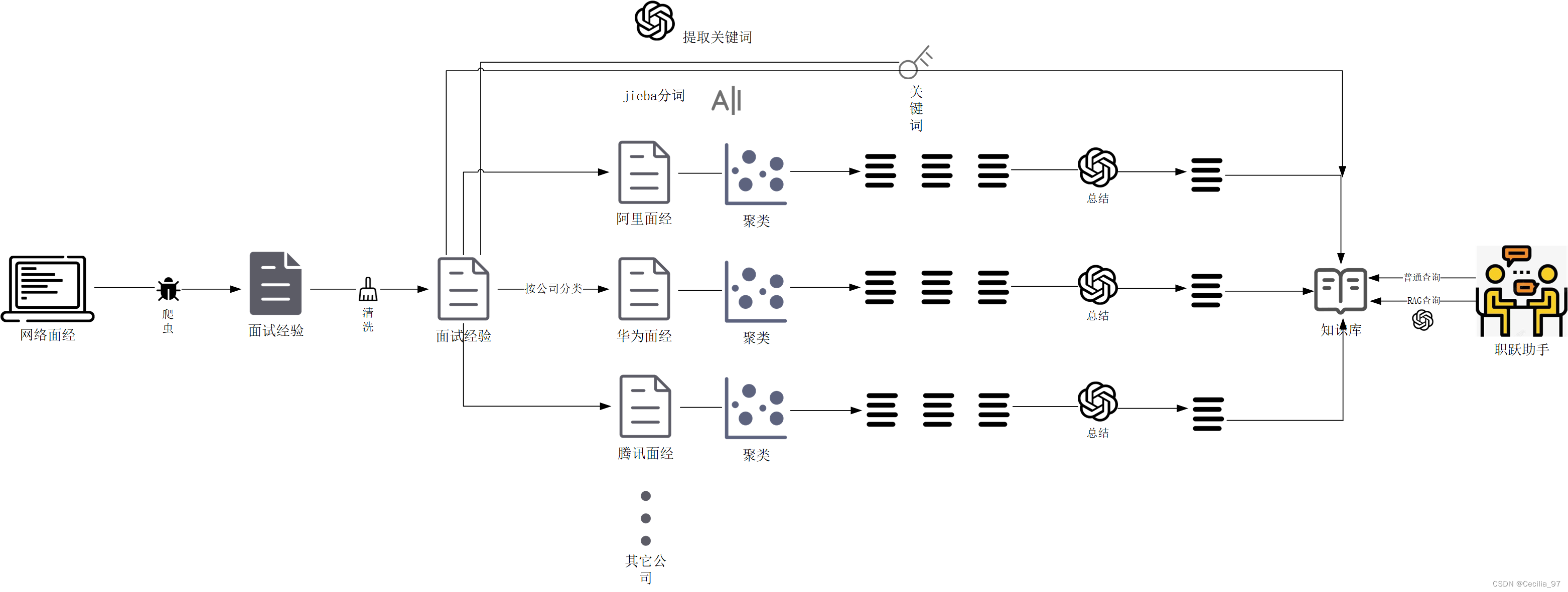 【项目实训】牛客网面经数据过滤 观察数据,发现了标题中常见的一些公司,例如“华为、美团、阿里”等,根据标题过滤,将牛客上爬到的数据按照不同的公司分类,并存储在json文件中。数组中每个元素是个字典,表示一个面试经验帖子,分为 `title`、`content`、`url`5. 讲数据按照不同的公司存放成json,最终筛选出26个公司的面试经验。公司名是键,公司对应的值是一个数组,数组中存放该公司的面试经验。2. 遍历同学爬到的csv文件,在标题中使用正则查找这些公司。1. 我定义了一个公司列表文件,里面列举了常见的公司。