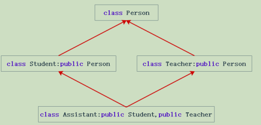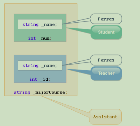 (person类的中的成员,会在student和teacher中都有一份,assistant继承student和teacher时,assistant中会有两份person,造成了数据冗余和二义性)