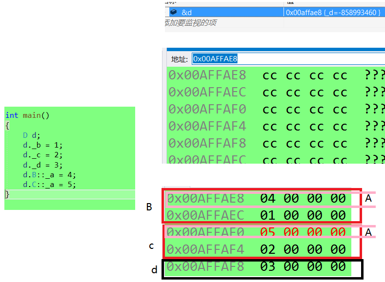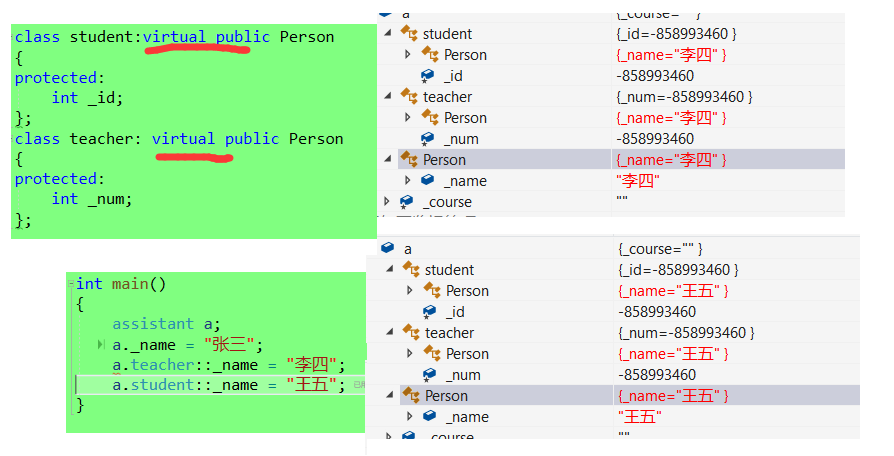 class A { public: int _a; }; class B:virtual public A { public: int _b; }; class C:virtual public A { public: int _c; }; class D:public B,public C { public: int _d; }; int main() { D d; d._b = 1; d._c = 2; d._d = 3; d._a = 4; d._a = 5; B b; b._a = 1; b._b = 3; B* ptr = &b; ptr->_a = 2; ptr = &d; ptr->_a = 6; }