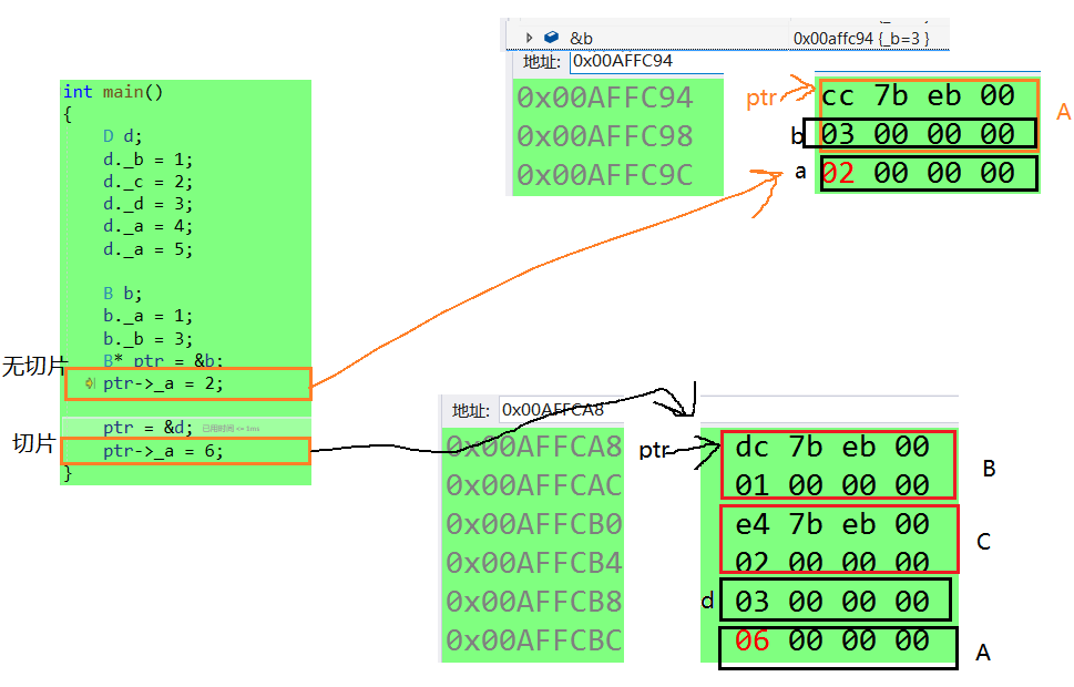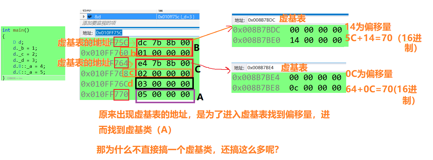 就像切片这种情况,ptr指向不同,那么距离虚基类的距离就不同,所以就必须要有虚基表的地址,来访问虚基表继而找到偏移量,然后访问到虚基类!