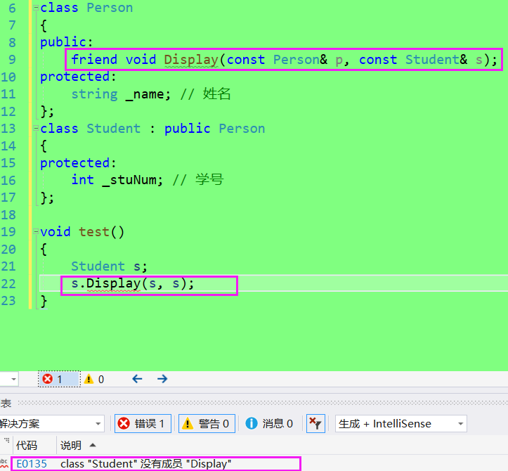 class Person { public: //friend void Display(const Person& p, const Student& s); protected: string _name; // 姓名 public: static int _num; }; int Person::_num = 0; class Student : public Person { protected: int _stuNum; // 学号 }; void test() { Student s; Person p; cout << p._num << endl; p._num++; cout << p._num << endl; s._num++; cout << s._num << endl; cout << &s._num << endl; cout << &p._num << endl; }