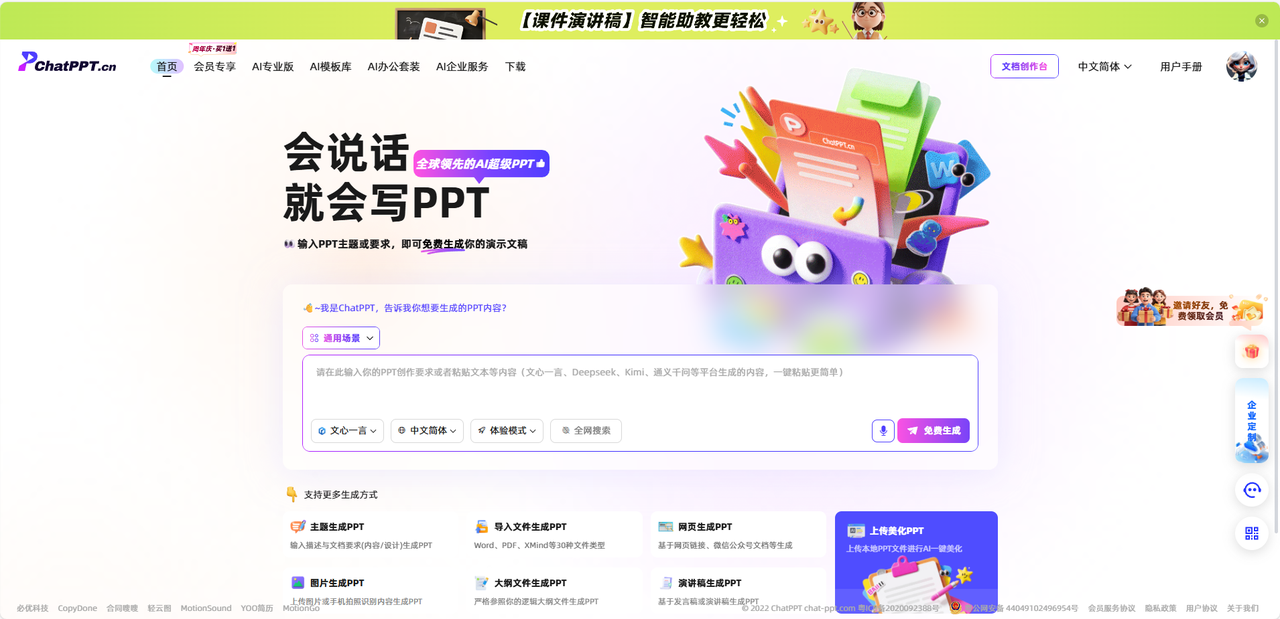 ChatPPT由珠海必优科技研发,其特点在于不局限于单点功能,而是提供了从生成、美化、辅写、演讲支持到分享与溯源的全链路服务,适合对内容准确性和视觉规范性都有较高要求的用户。