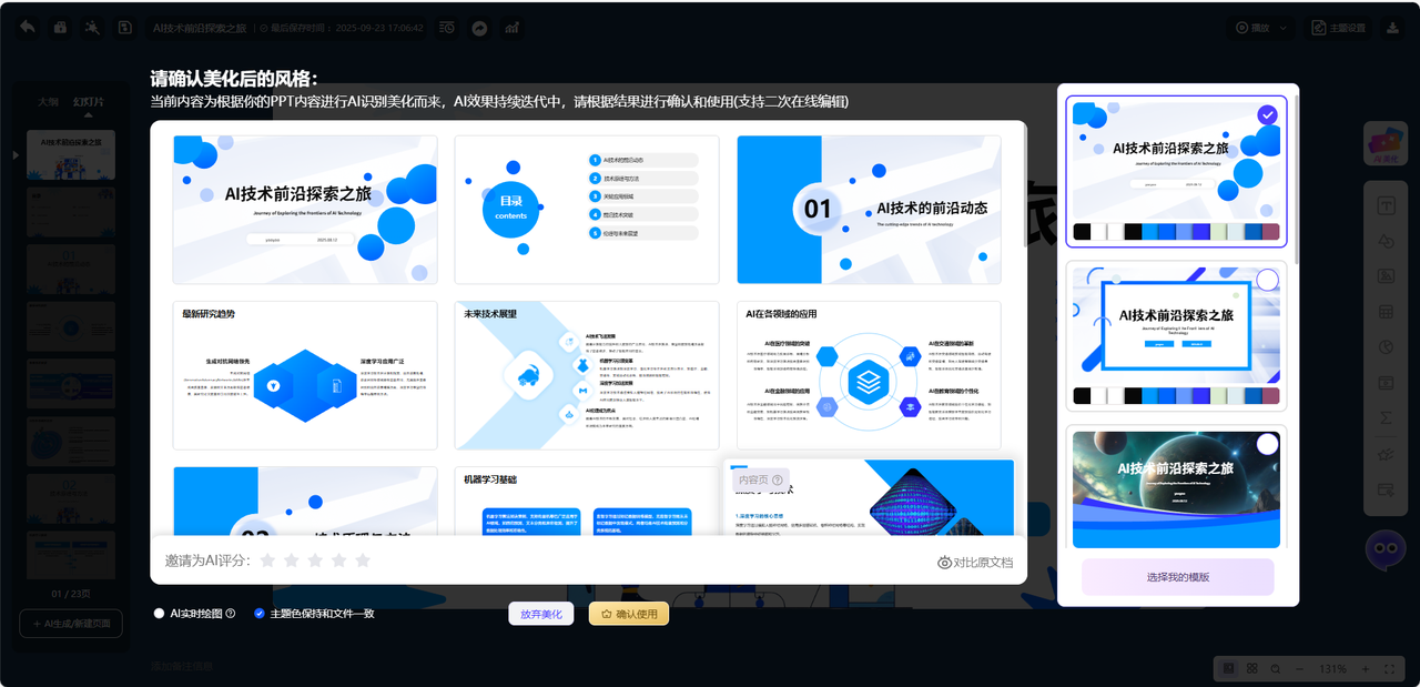 风格灵活调整:初次美化后若对效果不满意,可一键更换整体风格或主题色,实现视觉方案的快速迭代。