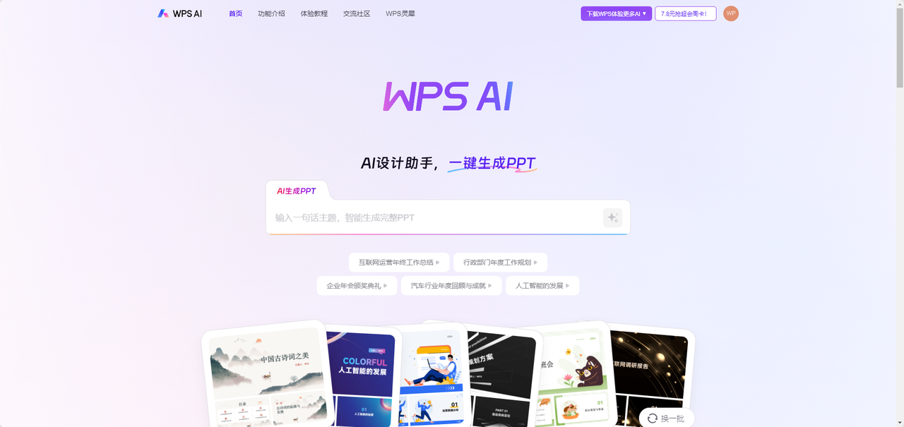 作为国内用户广泛使用的办公套件,WPS AI的PPT功能深度嵌入WPS/Office环境中,操作较为便捷。