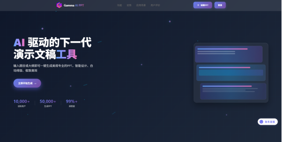 在设计感与视觉美学方面表现突出,可生成网页式卡片演示文稿,并支持导出为可编辑的PPT格式;能够集成多种协作平台,并具备文本转图像等AI功能。