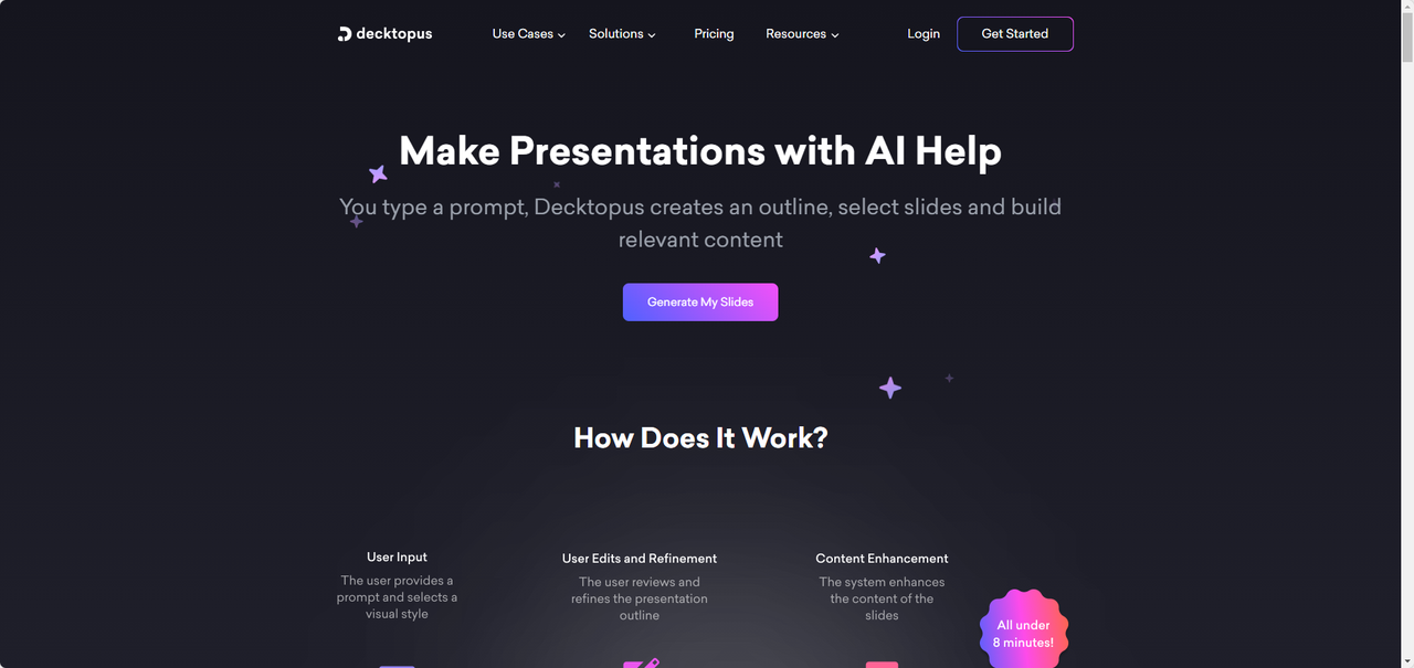 | Decktopus AI | 个性化定制引导 | 基础生成免费 | 图片/链接(无PPTX) | 定制化演示 |