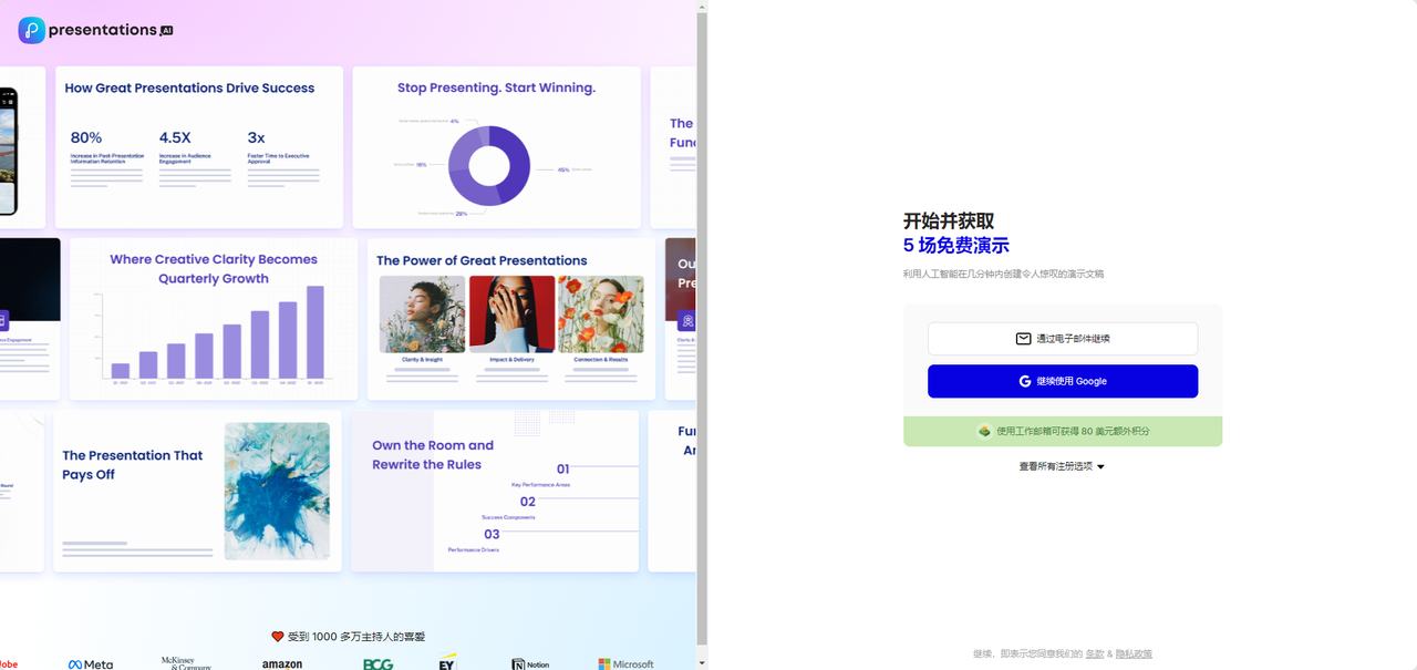 | Presentations AI | 企业协作功能强 | 基础编辑免费 | 需付费导出 | 团队协作 |