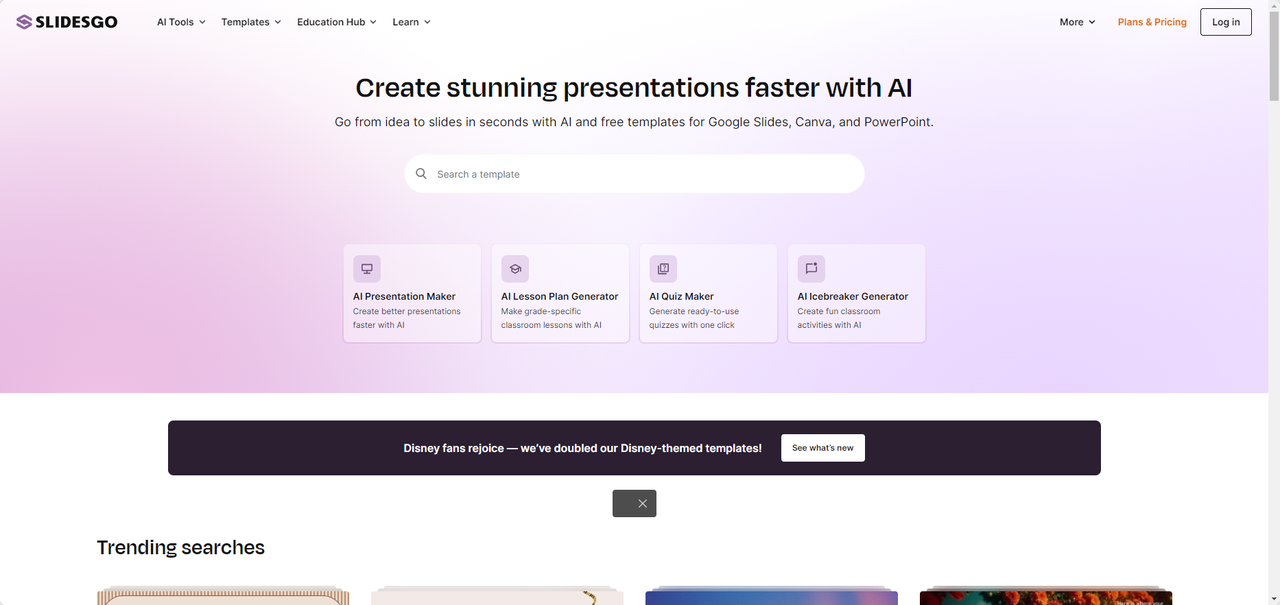Slidesgo是一款广受欢迎的AI演示文稿制作工具,它与Google Slides和PowerPoint保持良好兼容,为教师、学生和企业用户提供了一个快速、高效的幻灯片创作解决方案。你只需输入一个主题,Slidesgo就能在几秒钟内为你生成一份视觉效果出色的演示文稿。