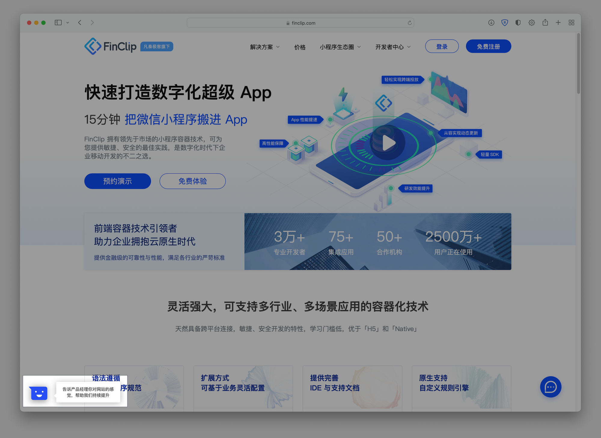 当您在浏览或使用 FinClip.com 时,如果遇到任何使用不畅或体验不佳的问题,都可以点击页面左下角的提示弹窗进行反馈。产品经理在收到您的反馈建议后,将会对齐进行及时处理,并告知您问题的处理进展。