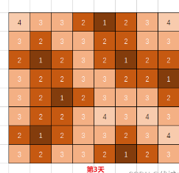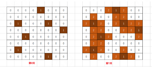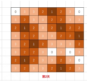 上面统计天数的方案,是将天数和矩阵元素值耦合起来,即矩阵元素格子内的值是几,就代表该格子是第几天被感染的。