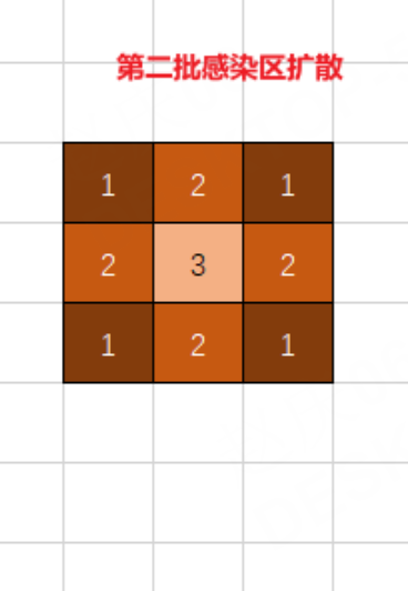 | 说明 | 1天以后,地图中仅剩余中心点未被感染;2天以后,全部被感染。 |