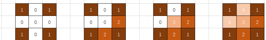 了解图的多源广度优先搜索的实现后,我们就需要考虑如何统计感染时间了,这里我们可以将感染区标记和感染时间捆绑在一起,比如第0天的新增感染区标记为1(即矩阵初始时元素1),第1天的新增感染区标记为2,这个标记是我们广度优先搜索过程中,遍历每个感染区位置上下左右时标记的。
