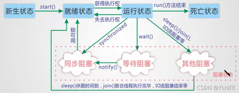 到达就绪态的四种方式:调用start()方法(线程刚刚调用);阻塞状态解除;调用yield方法;jvm主动切换到其他线程