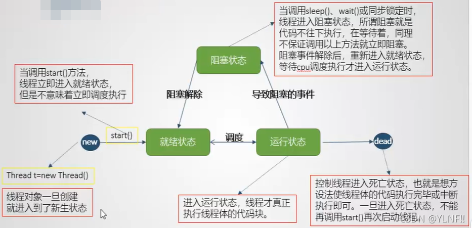 注意:运行状态被阻塞结束后不能马上进入运行态;线程死亡后不能复活(不能继续执行)