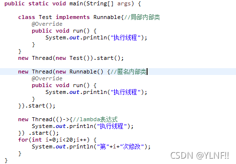 (1)继承Thread类,重写run方法,创建子类对象并调用子类start()方法;