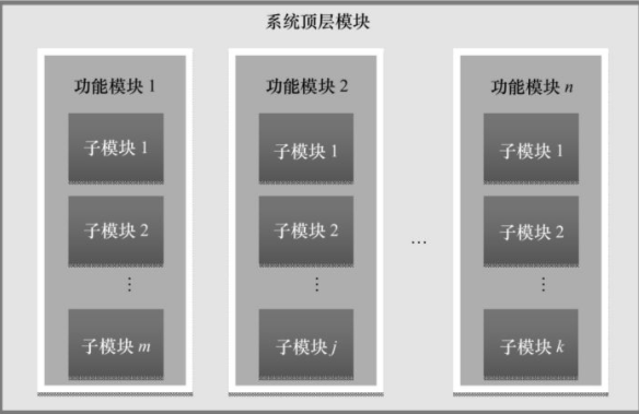 系统顶层模块只负责连线,将各功能模块正确地组合起来。各功能模块由对应的若干子模块组成,同一模块的子模块之间有着相应的级联关系。