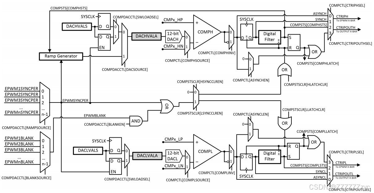 比较子系统围绕许多模块构建。每个子系统都包含两个比较器,两个参考12位DAC,两个数字过滤器和一个斜坡发生器。每个模块中的比较器表示“ H”或“ L”,其中“ H”和“ L”分别代表高和低。每个比较器都会生成一个数字输出,该数字输出表明正输入上的电压是否大于负输入的电压。比较器的正输入由外部引脚驱动。