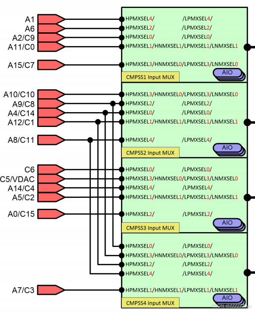 以TI F280025的CMPSS 2为例,正相端的输入信号只能由A4/A8/A9/A10/A12/C1/C8/C10/C11/C14提供。且需要配置CMPSS2 inp MUX中的HPMXSEL。如想使用C1或A12时。配置为: