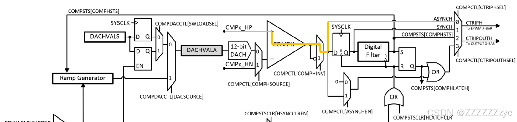 Cmpss2Regs.COMPCTL.bit.ASYNCHEN = 0; //比较器输出不馈入滤波器输出