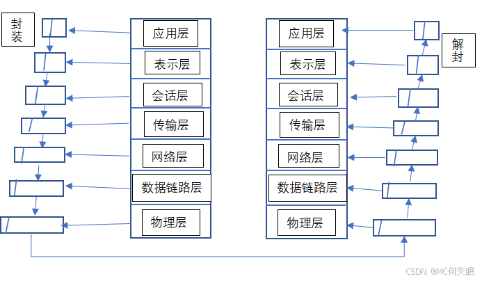 在传送数据时,先将数据传送道自己的应用层,再加上该层的控制信息,每向下一层,皆是如此,这个过程为封装。封装好后,通过连接的物理通道进行传输到目标,每向上一层,除去该层的控制信息,这个过程为解封。