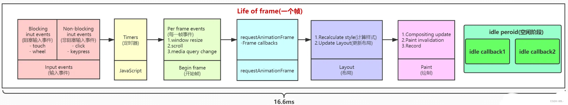 通过上面这张图可以清楚的知道,浏览器一帧会经过下面这几个过程: