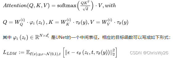 通过在Unet中间层引入cross attention,引入多模态的条件(文本,类别,layout,mask),其中cross attention的实现如下,其中Q来自latent space,K、V来自文本等另一序列: