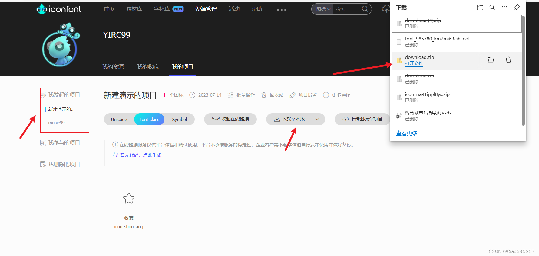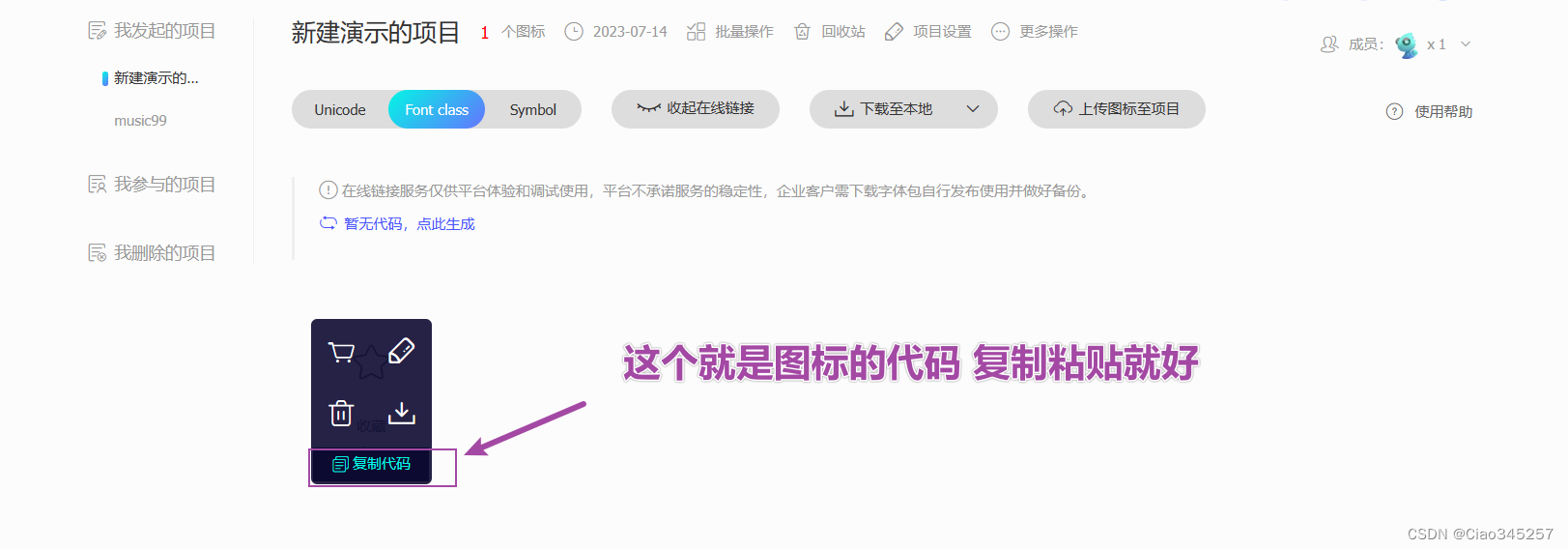 上图中图标的代码就在iconfont网站之前的 我的项目 中