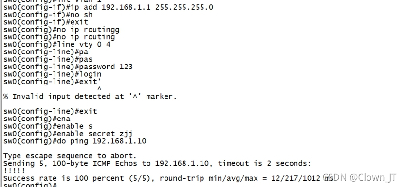 配置vlan 1IP地址并设置远程连接密码为123特权zjj
