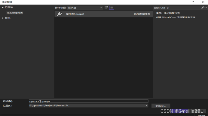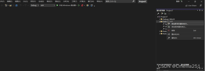 打开Visual Studio2022,新建一个项目,以project7为例,打开属性管理器,右击Debug x64,添加新项目属性表(P)...