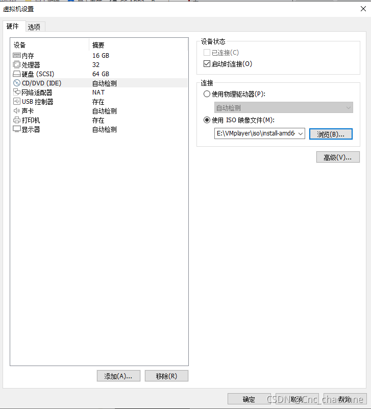 !!将刚刚下载好的iso镜像配置到cd中,勾选启动时连接