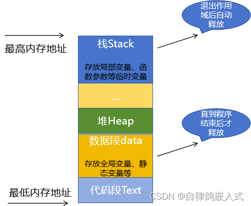上图展示了单片机的RAM内存分配结构,自顶部至底部依次为栈区(Stack)、堆区(Heap)、数据段(Data Segment)以及代码段(Code Segment)。从图中可以清晰地看到,局部变量通常存储在栈区(Stack)。这些临时变量在它们的作用域结束时会自动被释放,例如定义在函数内部的局部变量,每次函数调用时都会重新初始化。