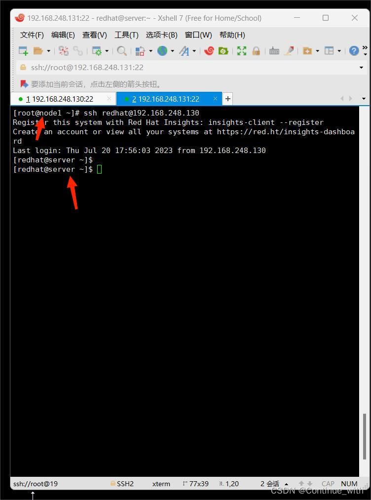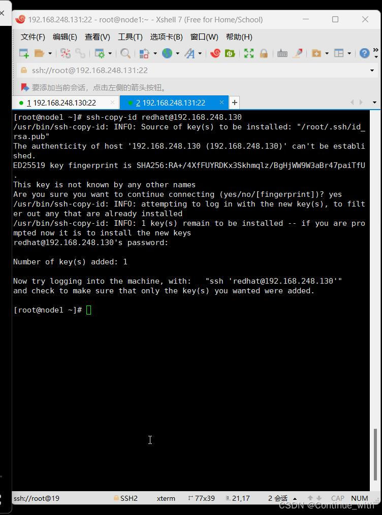 [root@node1 ~]# ssh-copy-id root@192.168.248.130 (第一次要输入yes,然后输入密码) 测试:用redhat账号进行远程登录