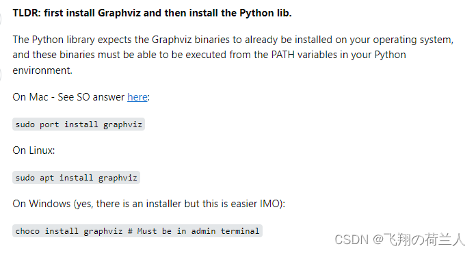 Graphviz报错: ExecutableNotFound: failed to execute ..., make sure the Graphviz executables Python的Graphviz包默认了系统里有这个包,因此要先在系统里装好,再pip install。解决方法参考stackoverflow。