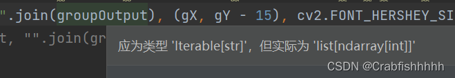 项目中,最后在银行卡卡面上画出轮廓时需要用到cv2.putText函数将检测到的数字打印出来,而参数中出现的join函数只允许可迭代str类型的变量,在部分的代码中,这一部分出现报错的原因,很有可能就是groupOut的类型不对,可能是list类型,以至于报错,
