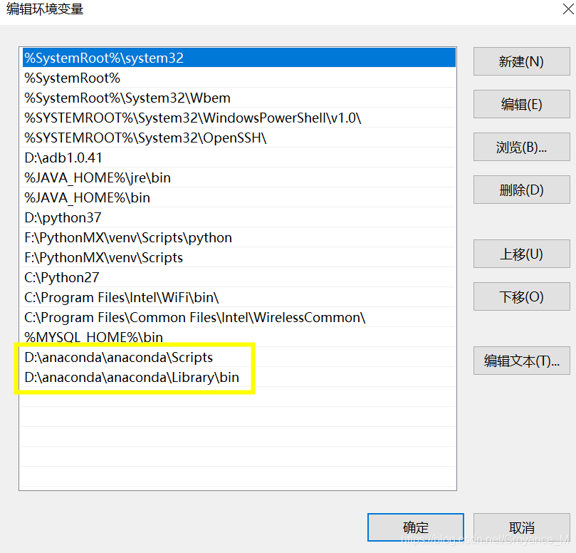 找到你anaconda的安装地址,找到Scripts和Library\bin,拷贝路径,放到控制面板的环境变量的path里