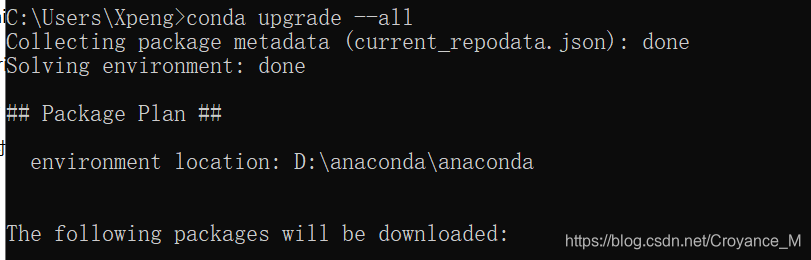 去cmd输入上面命令conda upgrade --all,成功运行了