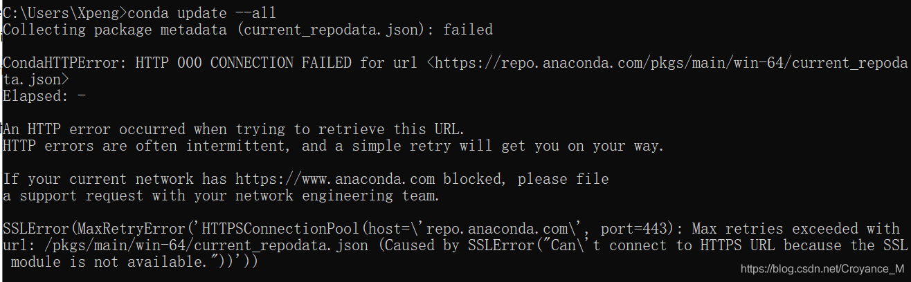 CondaHTTPError: HTTP 000 CONNECTION FAILED for url <https://repo.anaconda.com/pkgs/main/win-64/current_repodata.json>