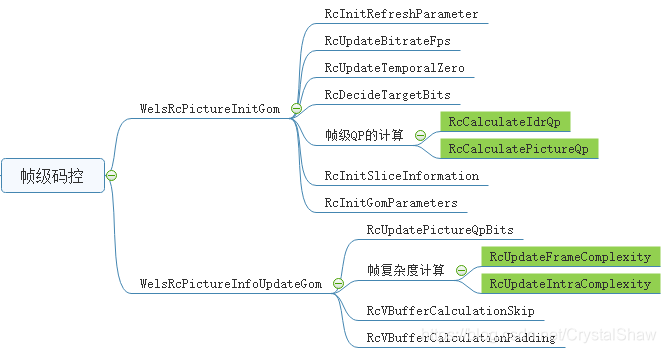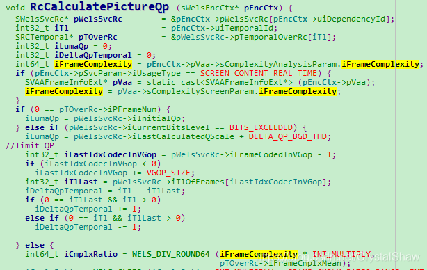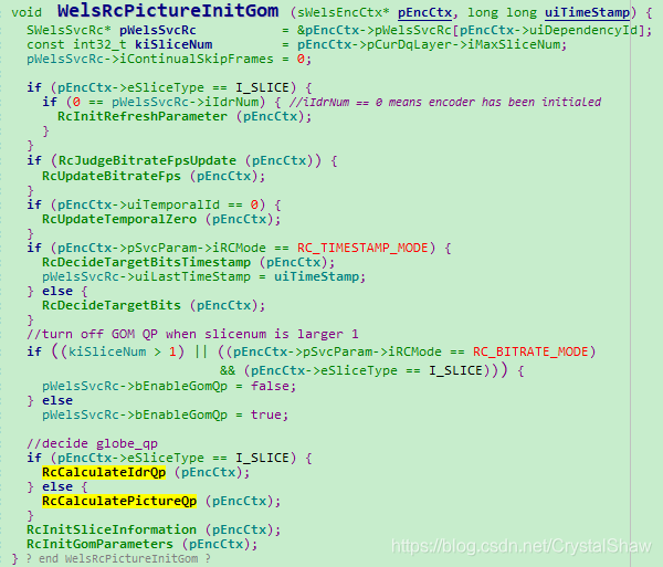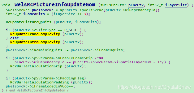 另外WelsRcPictureInitGom实际计算帧级QP的值。WelsRcPictureInfoUpdateGom更新码控的参数,用于后续再次调用WelsRcPictureInitGom时,计算帧级QP的值。