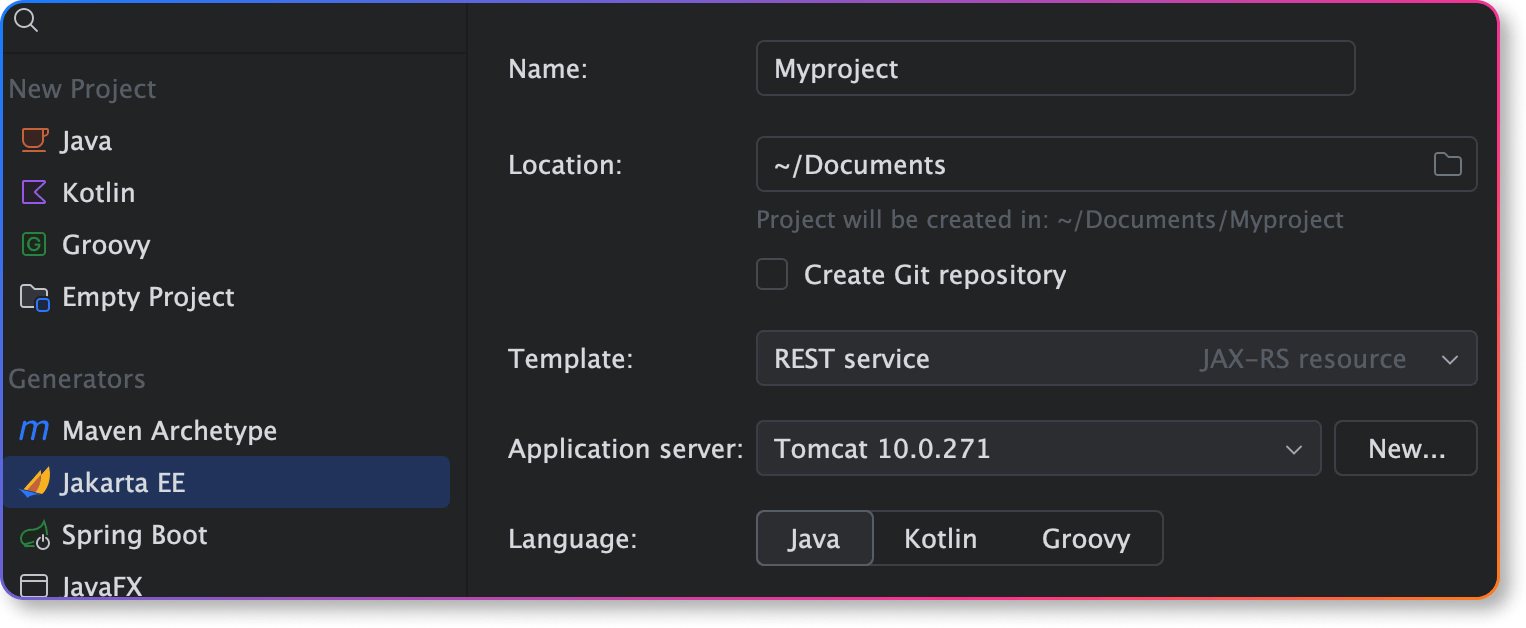 在专用向导中创建基于 Jakarta EE 的项目。所有核心信息都便捷地集中在第一屏,而第二屏则包含框架特定的设置——项目创建过程更加直观明了。